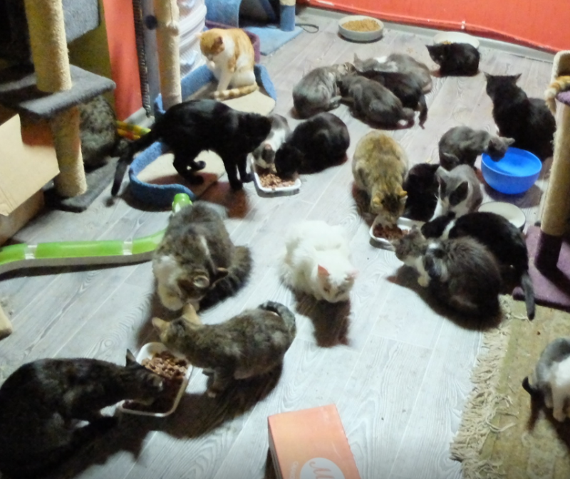 В приюте проживает около 50 котиков.